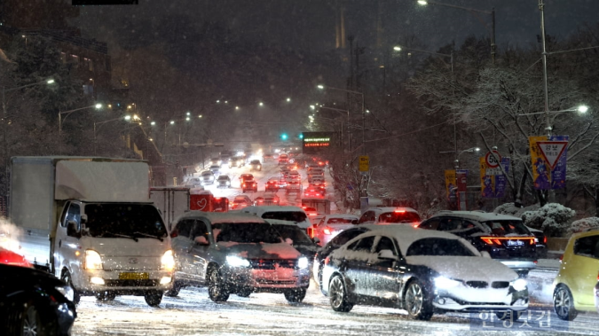 [포토] 순식간에 쌓인 폭설에 엉금엉금