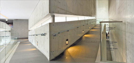 또한 산 정상에 만들어진 연못은 하늘을 주로 비추며 건물을 돋보이게 하고, 실내로 들어서면 강한 직선과 삼각형, 원 같은 기하학적 형태가 돌과 콘크리트라는 재료와 대비를 이루면서 의도된 공간의 강한 힘을 느끼게 한다. 좁고 높은 복도 공간은 벽면의 수평으로 길고 좁은 찢어진 틈과 함께 긴장감을 고조시킨다. 그러나 서양근대미술관에서처럼 공간에서 오는 신비하게 교감되는 미묘한 느낌을 발산하고 있지는 않다.