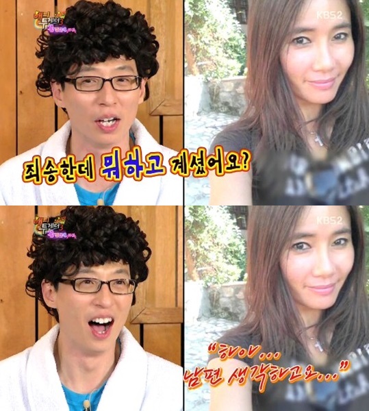 유재석은 정말 쿨하고 재미있으시다며 뭘 하고 계셨냐 물었고, 엄윤경씨는 “하아.. 남편 생각하고요..” 라고 말해 스튜디오를 초토화시켰다.