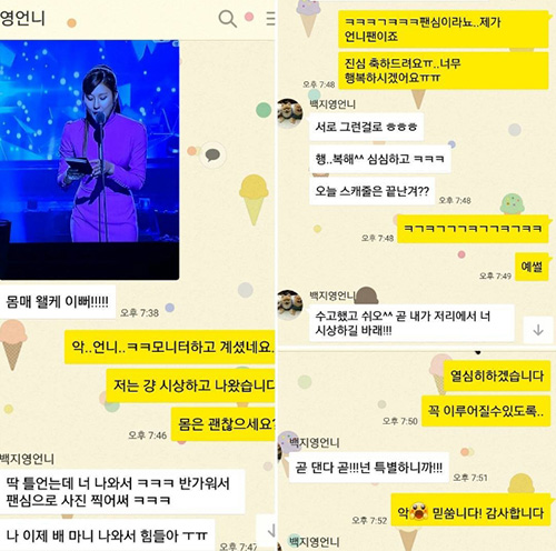 사진 속 문자메시지에는 열심히 활동하고 있는 스테파니를 선배 백지영이 응원하고 만삭으로 2세를 기다리고 있는 백지영을 후배 스테파니가 서로 진심으로 격려하고 응원하고 있다.