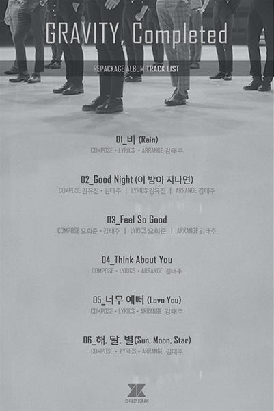 17일 크나큰은 공식 SNS를 통해 `그래비티, 컴플리티드(GRAVITY, Completed)` 앨범의 트랙리스트를 공개했다. 특히 이번 앨범 수록곡엔 멤버 희준과 유진이 작사, 작곡에 참여해 눈길을 끈다.