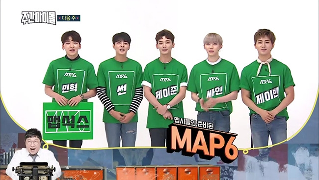 그룹 맵식스가 `주간아이돌`에 출연해 예능감을 뽐낸다.