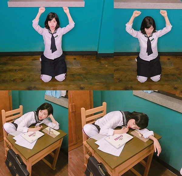 공개된 사진 속 도희는 교실 복도에 꿇어 앉아 벌을 서고 있다. 기가 죽은 듯 시무룩한 표정이 귀여움을 유발한다.
