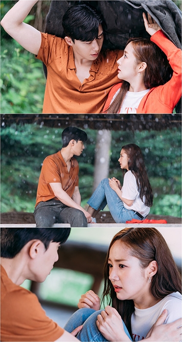 ‘김비서가 왜 그럴까’ 박서준과 박민영이 쏟아지는 폭우 속 초밀착 스킨십으로 보는 이들의 심장을 두근거리게 한다.