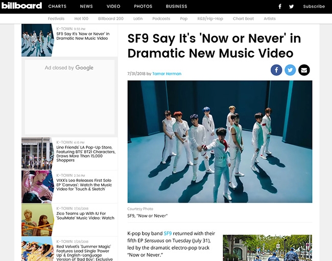 지난달 31일(현지 시간) 미국 음악 전문 매체 빌보드는 ‘SF9 Say It`s `Now or Never` in Dramatic New Music Video(역동적인 새 뮤직비디오에서 `질렀어`를 외치는 SF9)’라는 제목의 칼럼을 게재하고 신곡 ‘질렀어’를 집중 조명했다.