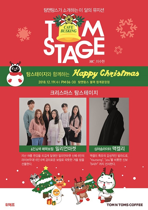 오는 19일 탐앤탐스 서울 블랙 청계광장점에서 열리는 이번 공연은 다가오는 크리스마스를 맞아 ‘해피 크리스마스’ 콘셉트로 진행되며 밀리언마켓의 신예 아티스트 6인이 참석해 6인 6색 감미로운 라이브를 선보일 예정이다.