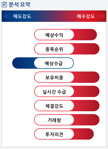 외국인, 기관 수급을 보면 외국인은 매도전환하고 있고, 기관은 매도전환하였다. 알파고는 외국인, 기관의 추가 매도 가능성을 54%로 예상하고 있다.