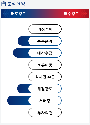 외국인, 기관 수급을 보면 외국인은 2일 연속 매도하고 있고, 기관은 5일 연속 매도하였다. 알파고는 외국인, 기관의 추가 매도 가능성을 34%로 예상하고 있다.