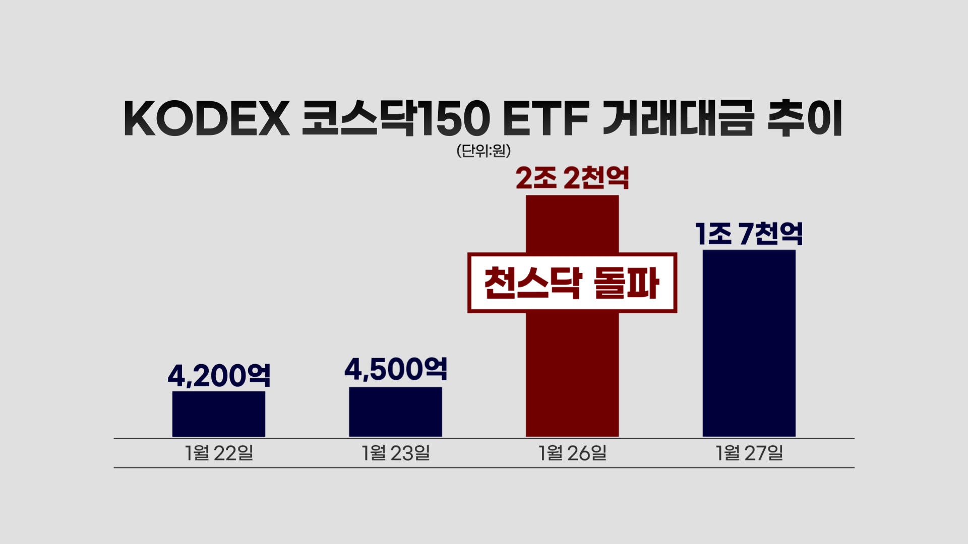 어제 하루 동안 KODEX 코스닥150 ETF 이 상품에만 거래대금이 2조원 넘게 몰렸는데요. 어제 하루 기준 국내 ETF 역사상 역대 최대 개인 순매수 기록을 세운 수준입니다.