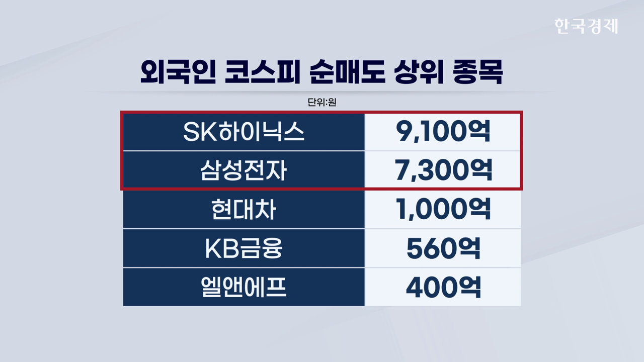 실제 외국인은 오늘도 2조1,000억원가량을 순매도했는데, 자세히 보면 삼성전자(-9,100억원), SK하이닉스(-7,300억원) 등 이들 종목을 1조6,500억원 어치 순매도했습니다.