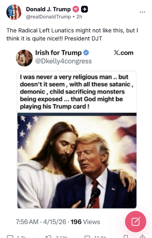 트럼프 대통령은 지난 12일 자신이 흰옷을 입고 붉은 망토를 걸친 채 병든 사람의 이마에 손을 얹은 이미지를 올렸는데, 자신을 예수에 비유한 것이라는 비판이 쏟아지자 약 12시간 만에 삭제했다.