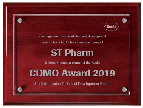 ▲ 에스티팜[237690]은 스위스 다국적제약사 로슈(Roche)에서 '로슈 항체 바이오 의약품 위탁·개발생산(CDMO) 어워드 2019'를 받았다고 26일 밝혔다.