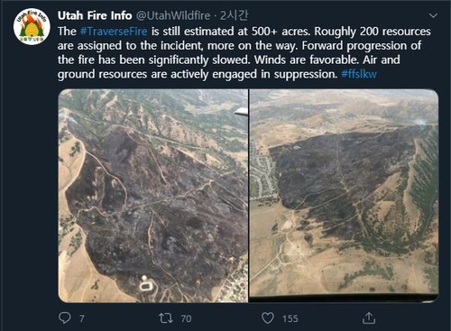 이 화재는 강한 돌풍을 타고 번지면서 유타주 리하이 인근 트래버스산 500에이커(약 2㎢) 이상을 태웠다.