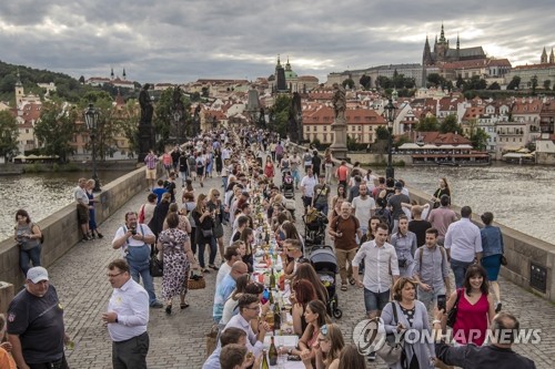 2일 CNN 방송에 따르면 체코 정부가 바이러스 확산 방지를 위한 '모임 금지령'을 완화하자 수백명의 참석자들이 지난달 30일 도시의 상징인 카를교 위에 500m 길이의 식탁을 설치하고 축하 만찬을 즐겼다.