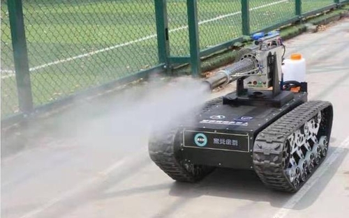 탱크처럼 무한궤도를 장착해 '미니 탱크'로 불리는 이 로봇은 시속 5㎞ 이상으로 이동하면서 매시간 1만㎡를 소독할 수 있다.