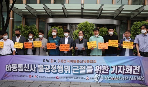 (서울=연합뉴스) 채새롬 기자 = 전국이동통신유통협회는 23일 서울 용산구 LG유플러스[032640] 앞에서 기자회견을 열고 통신3사가 고가 요금제 가입자 유치를 판매점 등 유통망에 강제하는 행위는 불공정행위라며 29일 공정거래위원회에 제소하겠다고 밝혔다.
