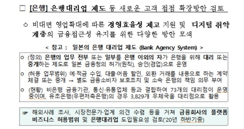 (서울=연합뉴스) 김남권 기자 = 금융당국이 비은행 금융기관 등에서도 은행 서비스를 제공하는 은행 대리업 제도 도입을 검토하기로 했다.