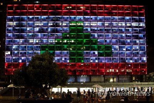 지난 5일 이스라엘의 지중해 도시 텔아비브 시청 벽에는 레바논 국기를 형상화한 조명이 켜졌다.