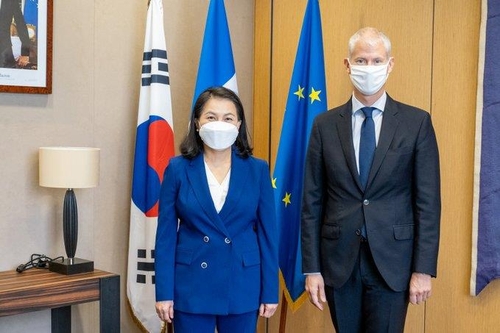 (파리=연합뉴스) 현혜란 특파원 = 유명희 산업통상자원부 통상교섭본부장이 10일(현지시간) 프랑크 리에스테르 프랑스 외교부 무역·유치 담당장관을 면담했다.