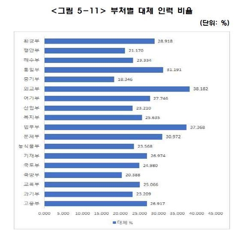 대체 가능 인력을 전체 인력 대비 비율로 따지면 외교부가 38.2%로 가장 높았다. 법무부(37.4%), 통일부(31.2%) 등이 뒤를 이었다.
