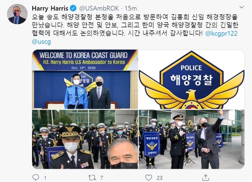 해리스 대사는 이날 오후 트위터를 통해 "해양경찰청 본청을 처음으로 방문해 김홍희 해경청장을 만났다"고 밝혔다.