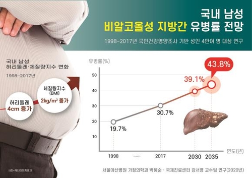 서울아산병원 가정의학과 박혜순·국제진료센터 강서영 교수팀은 1998∼2017년 국민건강영양조사 자료를 바탕으로 비알코올성 지방간의 향후 유병률을 예측했다.