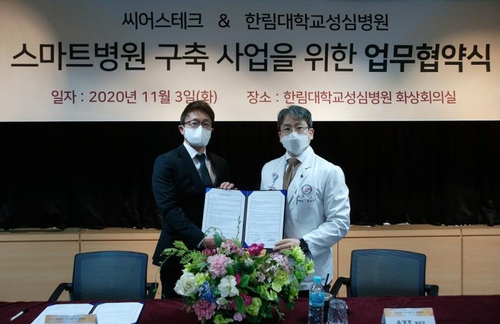 ▲ 한림대학교성심병원은 씨어스테크놀로지와 비대면·비접촉 진료시스템이 마련된 스마트병원을 구축하기 위한 업무에 협력하기로 했다고 6일 밝혔다. 협약에 따라 한림대성심병원은 감염관리의 효율성을 높이고, 웨어러블 의료기기 및 비대면 의료장비를 활용해 심장질환자 등을 실시간 모니터링하는 스마트 진료 프로세스 등을 구축할 방침이다. (서울=연합뉴스)