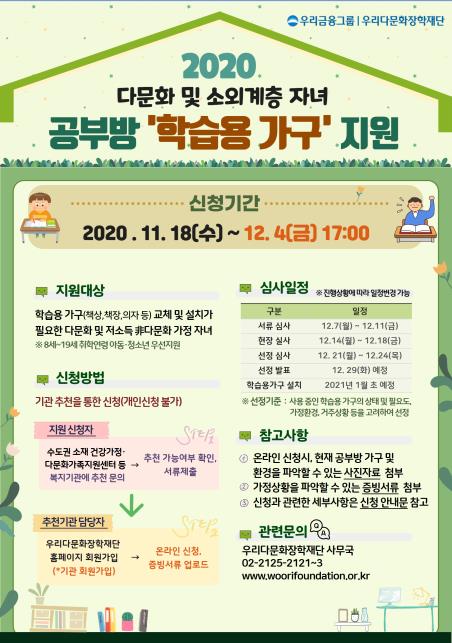 공부방 환경 개선사업은 취학 연령(8~19세)의 다문화 및 소외계층 아동·청소년에게 책상, 책장, 의자 등 학습용 가구를 지원하는 사업으로, 재단은 2014년부터 총 93가구, 157명에게 학습용 가구를 지원해왔다.