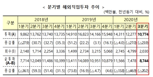 총투자액에서 투자회수액(지분매각·대부투자 회수·청산)을 뺀 순투자액은 87억4천만달러로 작년 3분기보다 20.2% 감소했다.