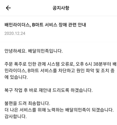 배달의민족을 운영하는 우아한형제들은 "주문 폭주에 따른 관제 시스템 오류로 오후 6시 38분부터 배민라이더스 서비스를 차단하고 원인 파악 및 조치 중에 있다"고 공지했다.