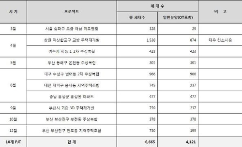 다음달 리모델링 최초로 주택도시보증공사(HUG)의 보증승인을 받은 서울 송파구 오금동 아남아파트(328가구·일반분양 29가구)를 시작으로 4월 경남 창원 마산합포구 주택재개발(1천538가구·일반분양 874가구), 전남 여수 학동 1·2차 주상복합(423가구) 등을 공급한다.