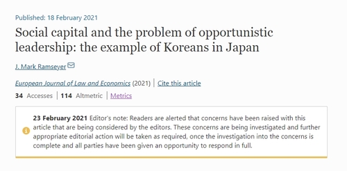 독일 출판사 스프링거는 23일(현지시간) 홈페이지에 유럽 학술지 '유럽법경제학저널'에 실린 '사회 자본과 기회주의적 리더십의 문제 : 일본 내 한국인들의 사례'에 "논문 내용에 대해 문제가 제기됐다"며 독자들의 주의를 당부했다.