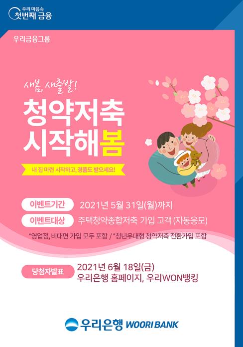 ▲ 우리은행은 청약저축에 신규 가입하는 고객을 대상으로 추첨을 통해 경품을 지급하는 '새봄 새출발! 청약저축 가입해봄' 이벤트를 5월 31일까지 실시한다고 29일 밝혔다. 이벤트 대상은 '주택청약종합저축', '청년우대형 주택청약종합저축' 신규가입 고객과 '주택청약종합저축'에서 '청년우대형 주택청약종합저축'으로 전환 가입한 고객이며, 추첨을 통해 갤럭시 버즈라이브 무선이어폰(10명), 커블체어(150명)를 제공한다. (서울=연합뉴스)