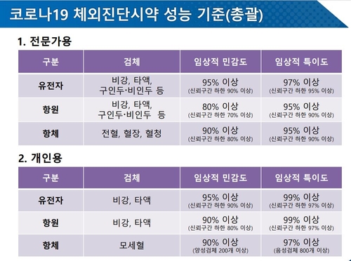 유전자증폭(PCR) 방식과 항체진단 방식에서도 개인용에 대해 전문가용과 같거나 그보다 더 높은 정확도를 기준으로 제시했다.