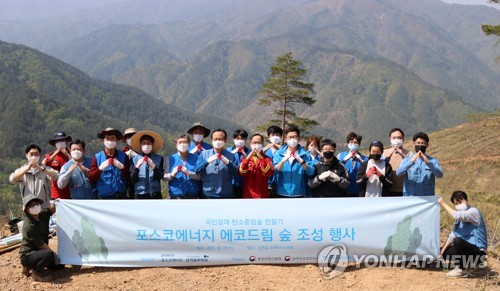 (서울=연합뉴스) 윤보람 기자 = 포스코에너지는 21일 강원도 삼척시 노곡면 일대에서 '탄소중립 숲 조성' 식재 행사를 열었다.