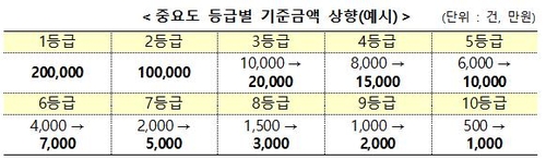 올해 3분기부터는 등급별 기준금액도 올라간다. 이미 법상 한도액(20억원)에 가까운 1·2등급을 제외하고 3등급은 1억원에서 2억원으로, 4등급은 8천만원에서 1억5천만원으로 각각 기준금액을 상향조정하기로 했다. 10등급 기준금액도 500만원에서 1천만원으로 오른다.