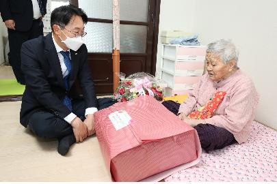 ▲ 한국토지주택공사(LH)는 어버이날을 맞아 LH 임대주택에 거주하는 100세 이상 어르신 126명에게 보행기, 의류 등 7종으로 구성한 선물 꾸러미를 전달한다고 6일 밝혔다. 김현준 LH 사장은 이날 서울 강북구 번동 5단지 영구임대주택을 찾아 최고령 거주자에게 선물 꾸러미와 꽃바구니를 전달하고 건강을 기원했다고 LH는 소개했다. (서울=연합뉴스)