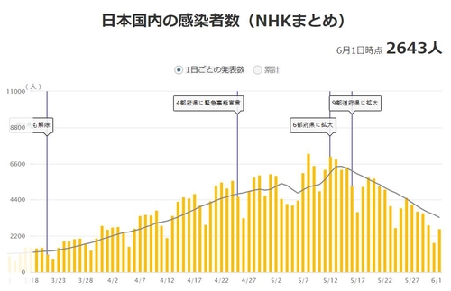 일본의 코로나19 하루 확진자는 지난달 29일 3천595명에서 30일 2천877명, 31일 1천793명으로 줄었다가 이달 1일 2천643명으로 재차 늘었다.