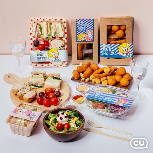 ▲ 편의점 CU는 에버랜드와 손잡고 피크닉 콘셉트의 간편식 시리즈를 출시했다고 9일 밝혔다. 출시 상품은 도시락, 샌드위치, 샐러드 등 5종이다. CU는 이달 말까지 이 상품을 구매한 뒤 '포켓 CU' 앱에 스탬프를 적립하는 고객 가운데 추첨을 통해 피크닉매트와 CU모바일 상품권 등을 증정하고, 15일 포켓 CU에서 에버랜드 포레스트 캠프 입장권을 한정 판매하는 이벤트를 한다. (서울=연합뉴스)