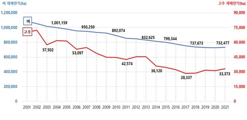 통계청이 30일 발표한 '2021년 벼·고추 재배면적조사 결과'에 따르면, 올해 벼 재배면적은 73만2천477㏊로 지난해보다 0.8%(6천45㏊) 증가했다.