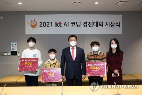 ▲ KT[030200]는 25일 서울 송파구 KT송파빌딩에서 '2021 KT AI(인공지능) 코딩 경진대회' 시상식을 열고 광주시 일곡초등학교 3학년 임도윤 학생에게 대상을 수여했다. KT는 미래 소프트웨어 인재 발굴과 양성을 위해 전국 초등학생을 대상으로 이번 행사를 열었다. 임도윤 학생은 영상인식 기술로 빈 페트병의 라벨 제거 여부를 확인한 후 학용품을 선물하는 '환경 자판기'를 개발했다. (서울=연합뉴스)
