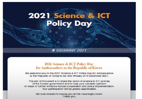 (서울=연합뉴스) 오수진 기자 = 과학기술정보통신부(과기정통부)는 주한 외교공관 대사, 과학기술·정보통신기술(ICT) 담당 외교관, 국제기구 대표 등을 초청해 9일 '2021년 주한외교관 정책 설명회'를 온라인으로 개최했다고 밝혔다.