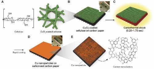 연구진은 비전도성 셀룰로스가 전도성 기판소재 역할을 할 수 있도록 셀룰로스를 순간적으로 탄화해 전도성을 확보했다.