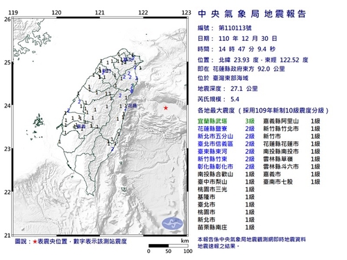 (상하이=연합뉴스) 차대운 특파원 = 30일 오후 2시 47분(현지시간) 대만 화롄(花蓮)에서 동쪽으로 90㎞가량 떨어진 바다 밑에서 리히터 규모 5.4의 지진이 발생했다고 대만 중앙기상국이 밝혔다.