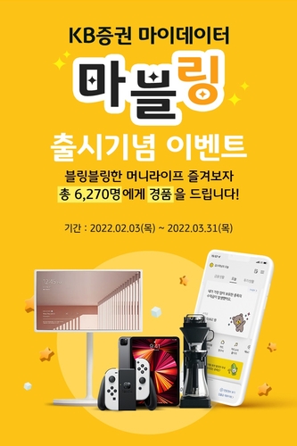 ▲ KB증권은 3일 마이데이터 서비스 '마블링'을 출시하고, 대고객 경품 이벤트를 진행한다고 밝혔다. KB증권 MTS(모바일트레이딩서비스)나 별도 앱을 통해 마블링 서비스를 이용하면 은행, 카드, 보험, 금융투자의 거래정보와 자산 정보를 한 번에 확인하고 관리할 수 있다. KB증권은 마블링 출시를 기념해 3월까지 가입 후 타사계좌 1개 이상을 연동한 고객 6천270명에게 추첨을 통해 LG스탠바이미, 아이패드 프로, 신세계상품권 등 경품을 증정한다. (서울=연합뉴스)