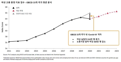 삼일PwC가 추정한 결과, 코로나 발생 이전보다 여성 실업자는 510만명 더 증가했고, 노동 시장에 참가하는 여성의 수는 520만명 줄어든 것으로 나타났다.