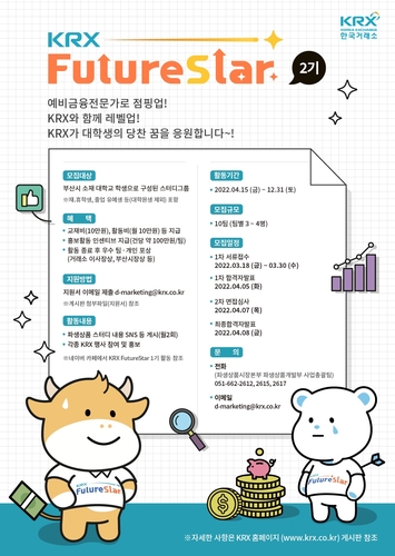 ▲ 한국거래소(KRX)는 부산 지역 대학생 대상 파생상품 스터디 그룹 'KRX 퓨처스타' 제2기를 모집한다고 24일 밝혔다. 거래소가 부산 지역 대학생의 파생상품 이해도를 높이고 MZ세대와 소통 채널을 마련하기 위해 작년에 이어 마련한 프로그램이다. 모집 기한은 오는 30일까지로 최종 합격 발표일은 내달 8일이다. 거래소 관계자는 "퓨처스타 1기의 높은 성과를 바탕으로 2기는 선발 규모를 두 배로 확대하고 부산시 참여, 팀별 멘토 지정 등 더욱 내실 있는 프로그램으로 구성할 것"이라고 밝혔다. (서울=연합뉴스)