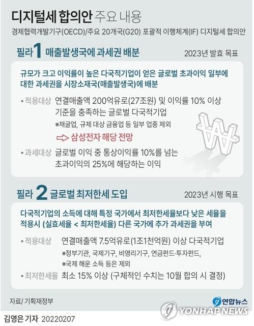 전 세계 136개국이 동참한 OECD/G20 IF 합의안은 이른바 디지털세 도입으로 불리는 매출발생국 과세권 배분(필라1)과 글로벌 최저한세율 도입(필라2)으로 구성돼 있다.