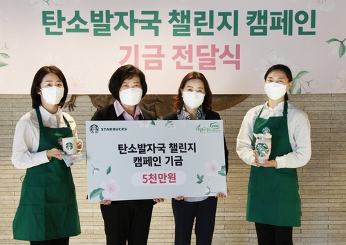 ▲ 스타벅스코리아는 자원순환사회연대에 5천만원의 환경보호기금을 전달했다고 28일 밝혔다. 이 기금은 스타벅스가 자원순환연대와 지난 2월 4일∼4월 11일 벌인 친환경 캠페인 '가치위해같이해요' 챌린지를 통해 조성한 것이다. 캠페인에는 고객 약 12만명이 참여해 장바구니 사용하기, 분리수거 하기, 다회용 컵 사용하기 등을 실천했다. 스타벅스는 9개의 친환경 미션 중 5개를 수행한 고객당 일정 금액을 적립해 총 5천만원을 모았다. (서울=연합뉴스)