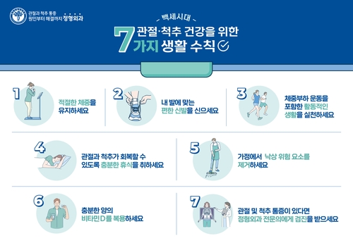 (서울=연합뉴스) 김길원 기자 = 대한정형외과학회(회장 김명구)는 초고령화 사회에 접어들면서 근골격계 퇴행성 질환이 늘고 있어 '백세시대 관절·척추 건강을 위한 7가지 생활수칙'을 마련했다고 22일 밝혔다.